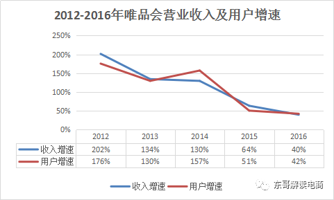 由于唯品会从未公布GMV数据,基本都是自营业务,所以,就看营收和用户同比增速关系。2012年到2016年的唯品会的收入和用户增长也是呈现强关联性,基本是保持一致的,并没有出现营收远超用户增速。