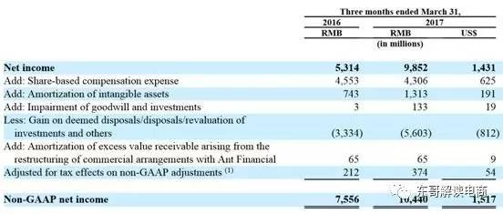 5月18日,阿里巴巴公布2017财年第4季度(自然年第一季度)财报。本季度,阿里实现收入385.79亿元,同比增长60%,创上市以来最高增速。净利润98.52亿元,同比增加了85%。非美国通用会计准则标准下,净利润104.4亿元,同比上涨38%。自由现金流79.8亿元,上涨82%。