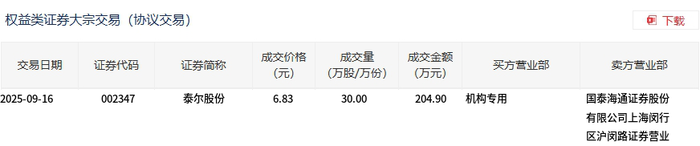9月16日,泰尔股份大宗交易成交30万股,成交额204.9万元,占当日总成交额的0.2%,成交价6.83元,较市场收盘价8.08元折价15.47%。