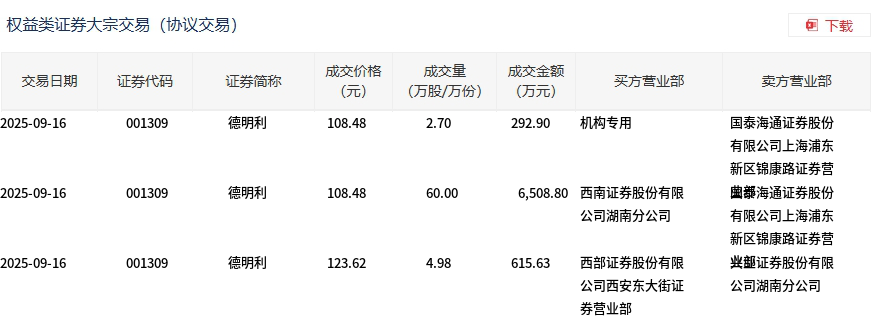9月16日,德明利大宗交易成交67.68万股,成交额7417.33万元,占当日总成交额的2.34%,成交均价109.59元,较市场收盘价125.5元折价12.67%,其中最高成交价123.62元,最低成交价108.48元。