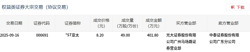 *ST亚太今日大宗交易平价成交49万股,成交额401.8万元