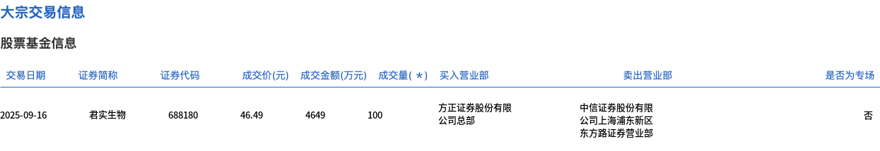 9月16日,君实生物大宗交易成交100万股,成交额4649万元,占当日总成交额的6.79%,成交价46.49元,较市场收盘价46.82元折价0.7%。