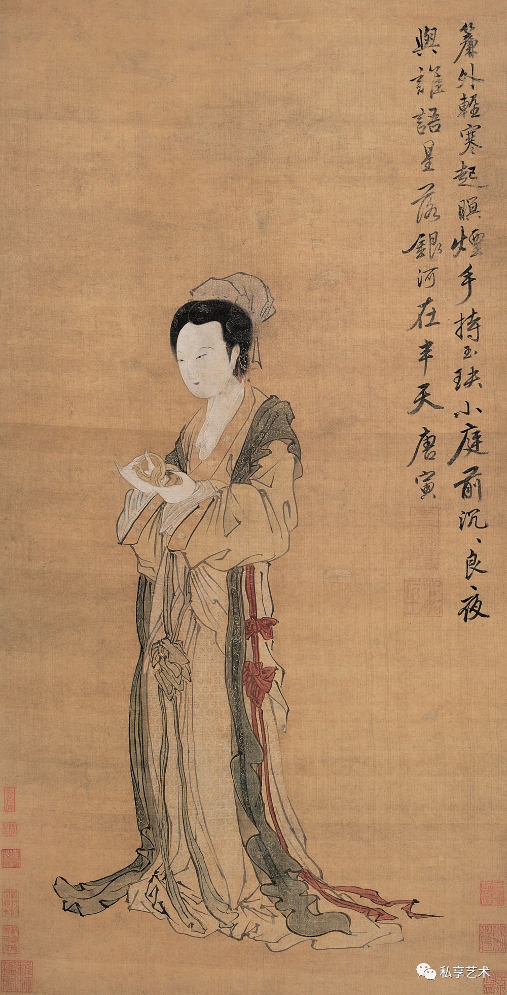 诗中意和画中情相互映发,使这幅画成为广为流传、也广受喜爱的著名作品。唐寅在这幅画中,借这位女子表达自己的感受。可以说世态炎凉、人世风烟都入女子神情中。秋来了,风起了,夏天使用的纨扇要收起了。