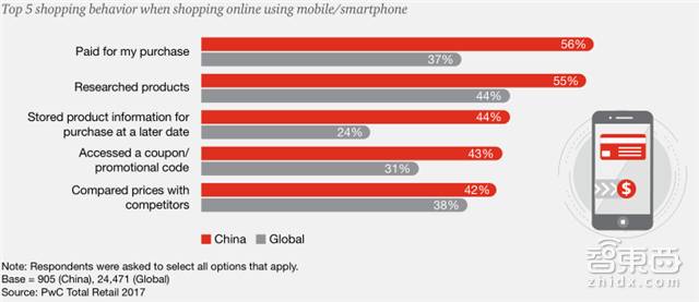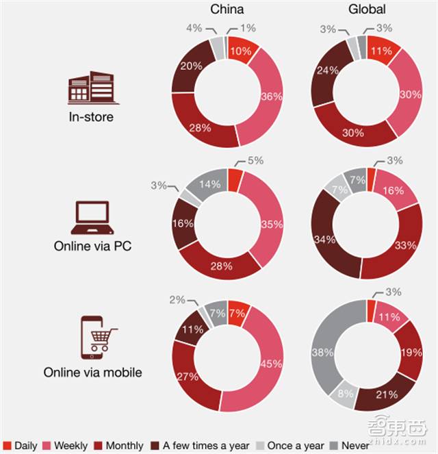与从同时,调研显示,约52%的中国消费者每周或每天通过移动设备或智能手机购物,相比之下,这一数字在全球仅达到14%。此外,41%的中国消费者通过社交平台获取促销信息,这一比例在全球为34%。