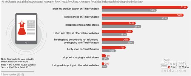 把天猫比作中国版的亚马逊其实不太确切。调研显示,61%的中国消费者会现在天猫进行购物检索,而全球仅39%的消费者会先上亚马逊了解商品。因此,天猫还充当了搜索引擎的角色。
