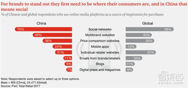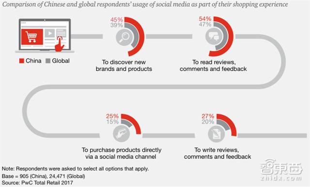45%中国消费者在社交媒体发现新的品牌和产品(全球39%),54%的中国消费者通过社交媒体对产品质量进行评论和反馈(全球47%),25%中国消费者直接通过社交渠道进行产品购买(全球15%),27%中国消费者会在社交媒体进行产品测评(全球20%)。因此,中国衍生了圈子、问大家这类的平台。