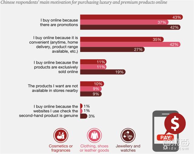 调研显示,在线奢侈品电商面临的主要问题包括:产品是否位列(69%的消费者表达了此类担忧)、在线购买不如实体店可看可摸(41%)、在线没有可提供建议的销售人员(19%)、物流环节可能有差池(16%)、接触到实体奢侈品商店的机会足够多(8%)。此外,调研还显示,便利(42%)和在线促销(37%) 是奢侈品网购行为的主要驱动力。目前来看,缺乏消费体验(不能直接观看和触摸产品)是在线奢侈品面临的主要障碍。