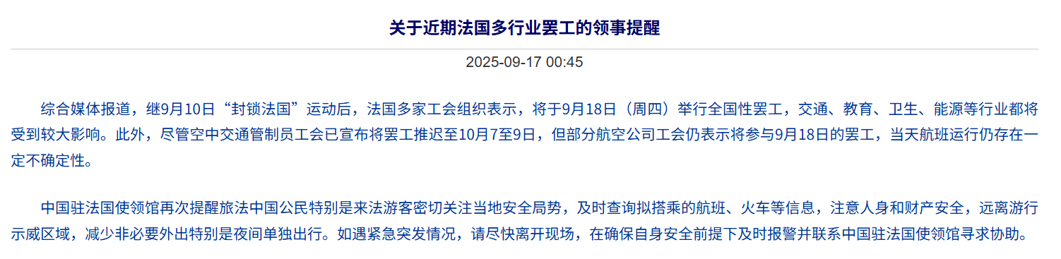 9月17日,中国驻法国大使馆在网站上发布关于近期法国多行业罢工的领事提醒,多家工会组织将于9月18日(周四)举行全国性罢工,交通、教育、卫生、能源等行业都将受到较大影响。