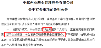 5月19日,中邮基金在官网发公告称,中邮投资总监邓立新“因其个人行为,正在接受相关部门调查”,目前公司已经暂停邓立新中邮风格轮动基金经理职务。