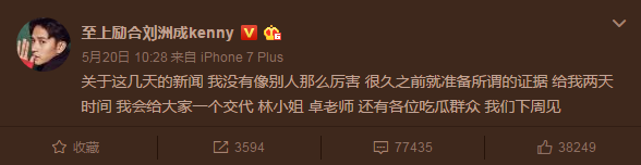 至上励合成员刘洲成日前被控在妻子怀孕期间家暴,之后又有“睡女粉丝”等黑料曝出。今日(5月20日)刘洲成首度在微博回应此事,称给他两天时间,会给大家一个交代,并点名妻子林小姐和卓伟老师,预告下周见。
