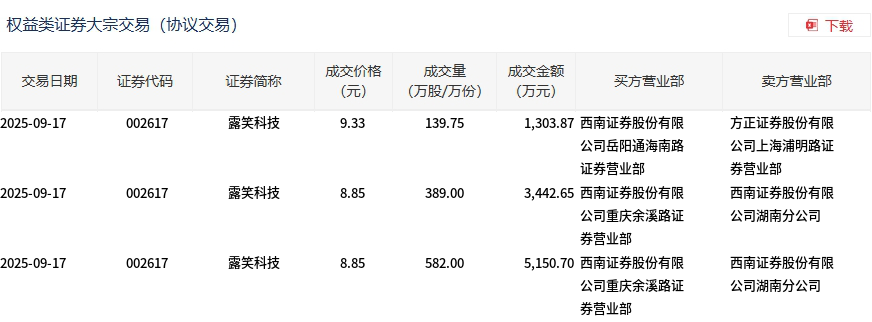 9月17日,露笑科技大宗交易成交1110.75万股,成交额9897.22万元,占当日总成交额的8.83%,成交均价8.91元,较市场收盘价10.81元折价17.57%,其中最高成交价9.33元,最低成交价8.85元。
