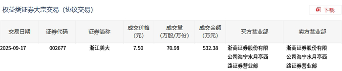9月17日,浙江美大大宗交易成交70.98万股,成交额532.38万元,占当日总成交额的0.99%,成交价7.5元,较市场收盘价7.78元折价3.6%。