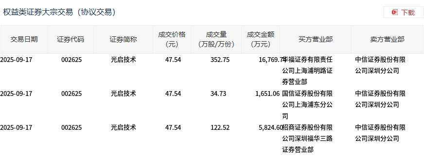9月17日,光启技术大宗交易成交510万股,成交额2.42亿元,占当日总成交额的8.88%,成交价47.54元,较市场收盘价48.76元折价2.5%。