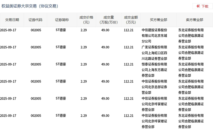 ST德豪今日大宗交易折价成交294万股,成交额673.26万元