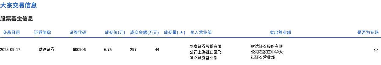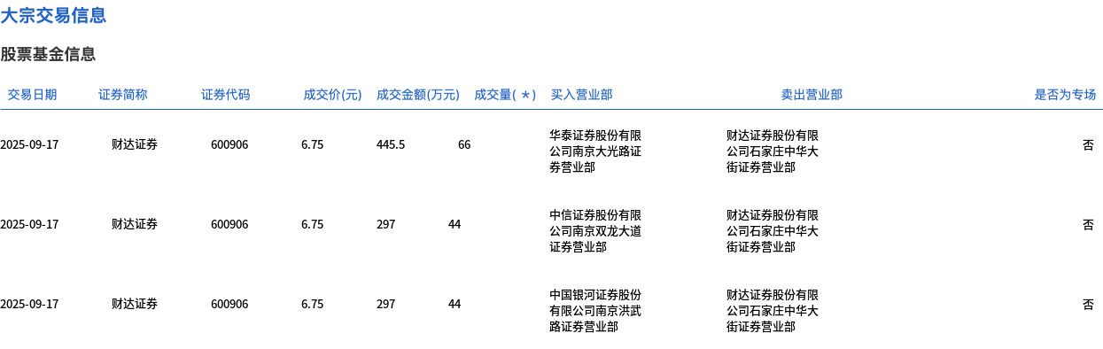 9月17日,财达证券大宗交易成交198万股,成交额1336.5万元,占当日总成交额的4.52%,成交价6.75元,较市场收盘价7.52元折价10.24%。