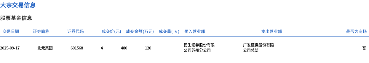 北元集团今日大宗交易平价成交120万股,成交额480万元