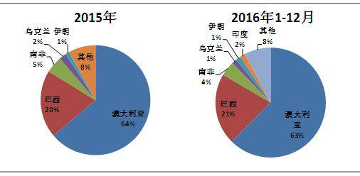 2016年进口量前十的国家是:澳大利亚、巴西、南非、印度、伊朗、乌克兰、智利、秘鲁、毛里塔尼亚和加拿大。南非虽然比重比2015年有所减少,但是仍然超过印度,位居第三名。