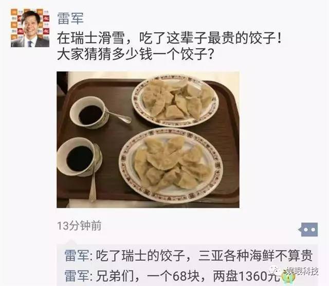 雷军开始在社交平台上频晒瑞士滑雪的照片,还吐槽说点了68块钱一个的饺子,并且吃了两盘。