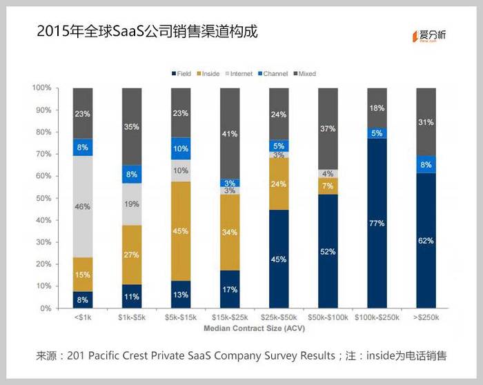 SaaS公司的主要销售渠道还是直销为主,渠道作为补充。具体直销的构成来看,随着客户单价提高,客户现场销售的比重提升,网络销售及电话销售的比重减少。