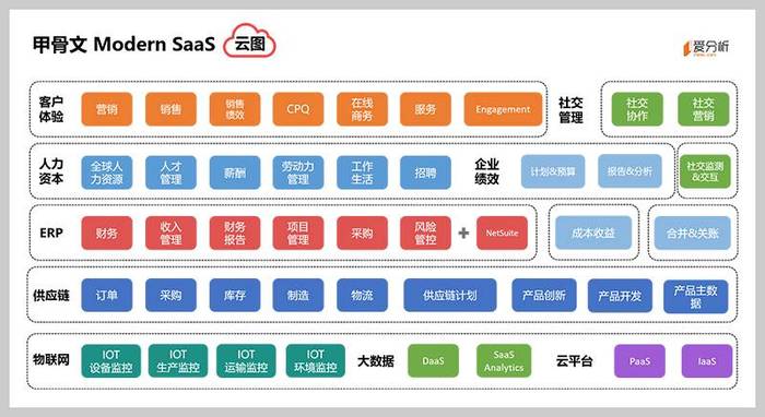 以上是甲骨文的云图,最上面的客户体验是CRM的升级版,更加突出客户体验和客户全生命周期,已经向前扩展到数字营销,向后延伸到财务,更重要的是有社交协作能力;