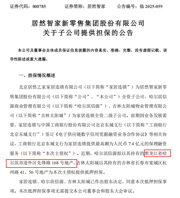 2025年以来,居然智家多次运用类似担保模式。本月15日,该公司宣布了长春居然之家企业管理有限公司以持有的一处16.05万平方米购物中心房产,为5亿元授信提供抵押担保。居然智家在公告中强调,家居连锁作为公司全资子公司,本次担保事项风险可控。因此,家居连锁未提供反担保。