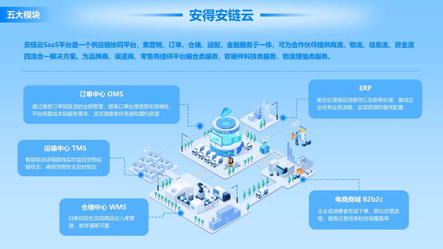 安得安链云是深度融合“四流”(商流、物流、信息流、资金流)的供应链协同SaaS平台,集营销、订单、仓储、运配、金融服务于一体,可为合作伙伴提供商流、物流、信息流、资金流四流合一解决方案,从平台服务、科技赋能、物流增值三大维度,精准解决企业供应链核心痛点。