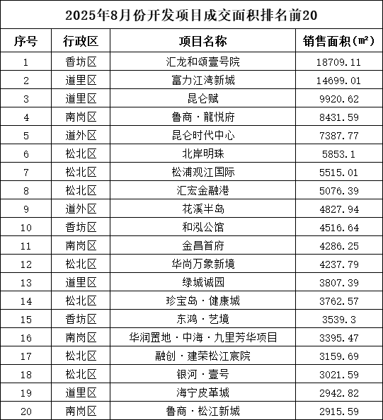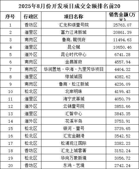 在成交方面,8月份市场分化现象显著。根据成交数据,黑龙江锦钰汇龙房地产开发有限公司开发的“汇龙和颂壹号院”以1.87万平方米的成交面积和2.58亿元的成交金额,同时摘得成交面积和金额双料冠军,反映出香坊区市场热度正在上升。