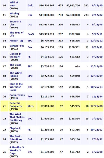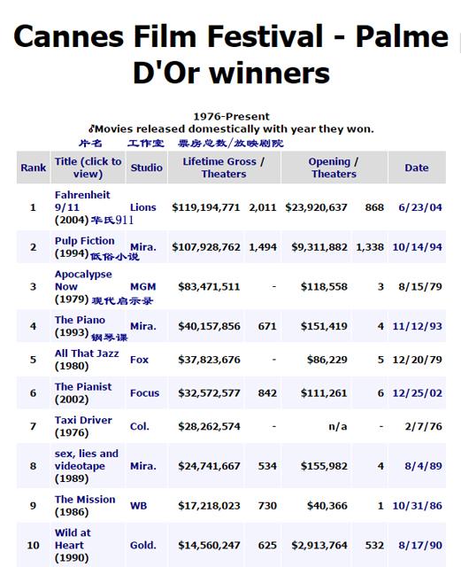 亚马逊旗下的票房数据统计网Mojo,列出了从1976年到2015年历届戛纳电影节金棕榈作品公映之后的北美票房成绩(2016年金棕榈作品《我是布莱克》还在全球各地公映中)。排名第一的乍听起来很意外,是迈克尔.摩尔2004年的反布什总统纪录片《华氏911》,它在北美取得近1亿2千万美元的惊人票房,在全球更拿下2亿2千万美元,不但在“金棕榈俱乐部”的票房排名中超过第二名的《低俗小说》(1亿零8百万美元),也在纪录片影史上成为了票房冠军,远高于同期第二名的《帝企鹅日记》(7千7百万美元)。