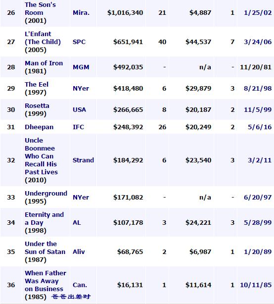 而从第四名的《钢琴课》(1993)开始,就再没哪部金棕榈作品能在北美票房中超过5000万美元。非英语金棕榈影片中在北美票房最高的,是迈克尔.哈内克的《爱》(2012),排名第14,数据直降到百万级的670万美元。这一榜单里,在2000年后影片中,票房最低的,是阿彼察邦的《能召回前世的布米叔叔》(2010),排名32位,当然实验性颇强的这部泰国电影在北美仅被排了6家影院,收获18万美元票房。而榜上36部影片中的最后一名,是库斯图里卡的《爸爸出差时》(1985),凄惨到只被排了一家影院拿到区区1万6千美元票房。显而易见,40年来,在抵触外语片的北美市场上,即便是被金棕榈加持,也很难获得院线和观众的青睐。