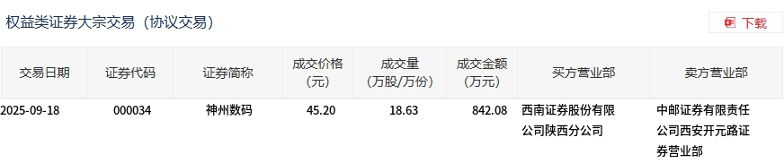 9月18日,神州数码大宗交易成交18.63万股,成交额842.08万元,占当日总成交额的0.21%,成交价45.2元,较市场收盘价45.34元折价0.31%。