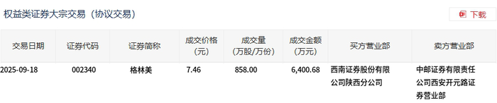 9月18日,格林美大宗交易成交858万股,成交额6400.68万元,占当日总成交额的3.64%,成交价7.46元,较市场收盘价7.45元溢价0.13%。