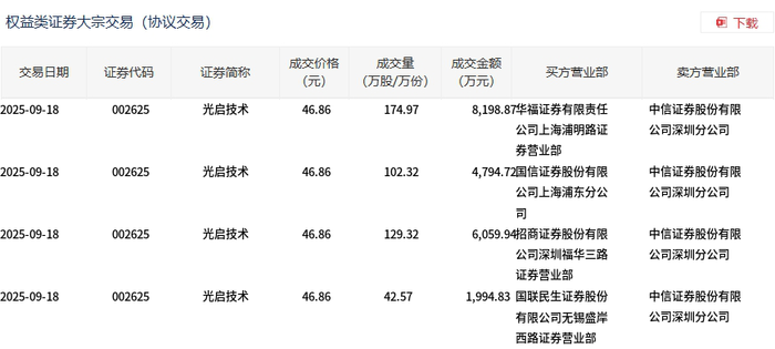 9月18日,光启技术大宗交易成交449.18万股,成交额2.1亿元,占当日总成交额的7.13%,成交价46.86元,较市场收盘价48.06元折价2.5%。