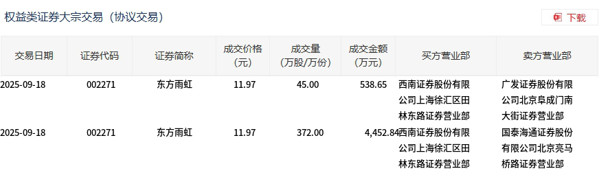 9月18日,东方雨虹大宗交易成交417万股,成交额4991.49万元,占当日总成交额的6.81%,成交价11.97元,较市场收盘价12.6元折价5%。