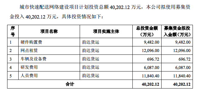 以韵达为例,拟在北京、上海、广州、深圳、杭州、武汉、南京、苏州等八个重点城市,投资建设快递集散中心、配送网点,以及购置相应的车辆、信息化设备等,建设快速城市配送网络。