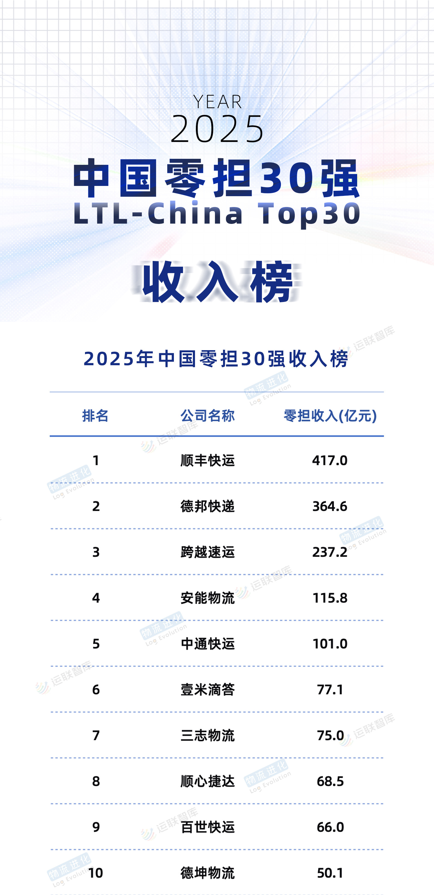 并购后,企业战略上的区别,正在形成零担市场的新格局。在物流进化TransLog发布的《2025中国零担企业30强》排行榜中,上述并购案例涉及的企业,已经常年稳定在前十强当中。