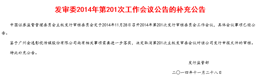 之后,金逸影视的IPO审核计划暂时被搁置。证监会新闻发言人张晓曾军在证监会的例行发布会上表示,证监会目前对金逸影视的相关情况正在落实,已经取消了对金逸影视201次发审委的审核。