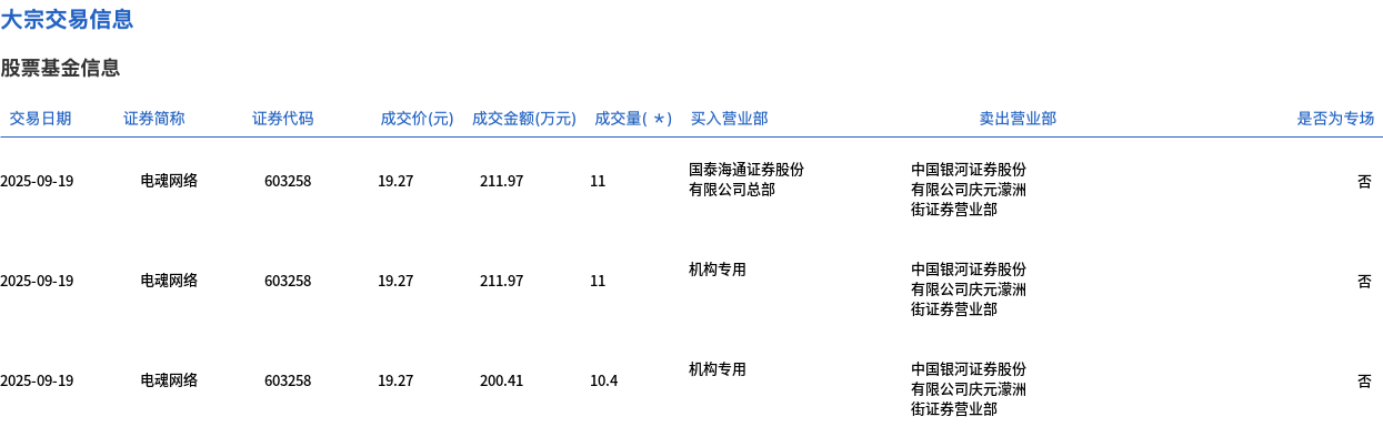 9月19日,电魂网络大宗交易成交32.4万股,成交额624.35万元,占当日总成交额的9.92%,成交价19.27元,较市场收盘价21.44元折价10.12%。