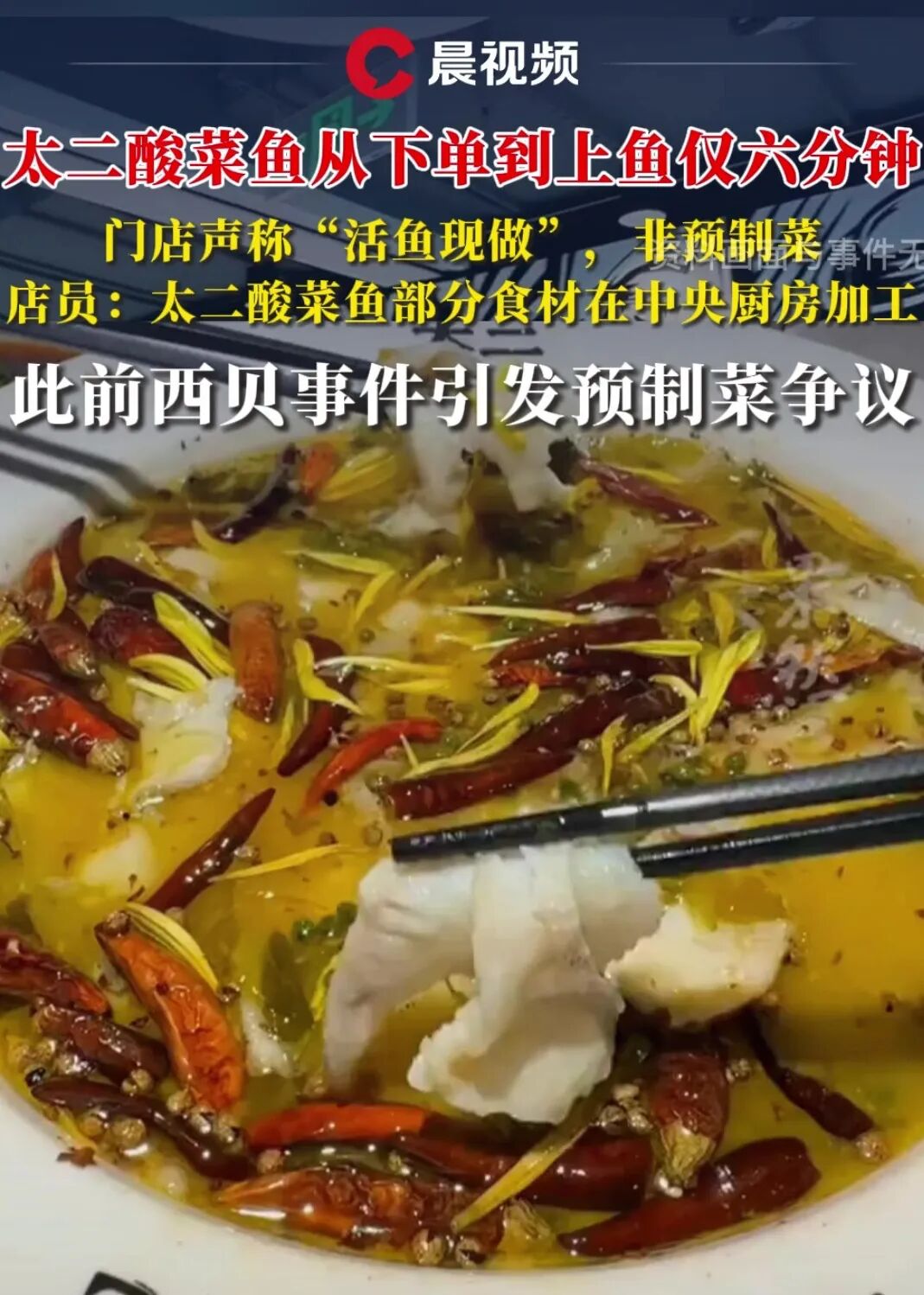 2025年9 月,浙江经视记者走访杭州某太二门店,点单后仅7分钟,酸菜鱼、小菜等三道菜便全部上齐。面对质疑,店员解释“鱼是统一配送,门店现场切片腌制”,但这与太二长期宣传的“活鱼现做”形成明显反差。