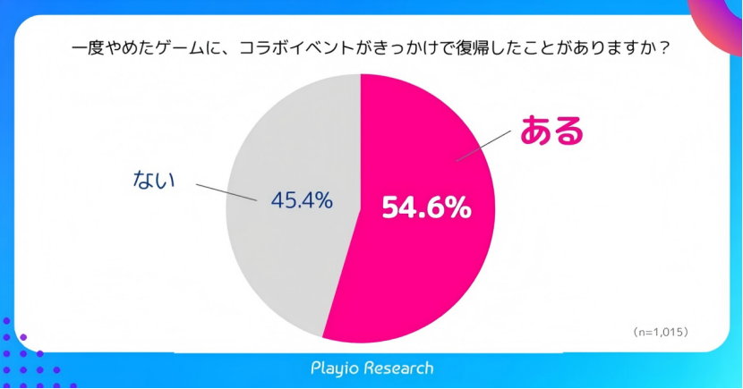 今年,日本SpySmart研究机构携手Playio Research及LIVEOPSIS等共同发布了关于IP联动现状的深度报告,数据显示,高达54.6%的用户曾因某个联动活动而回归曾经退坑的游戏,与此同时,IP联动策略也显著提升了游戏的用户活跃度。
