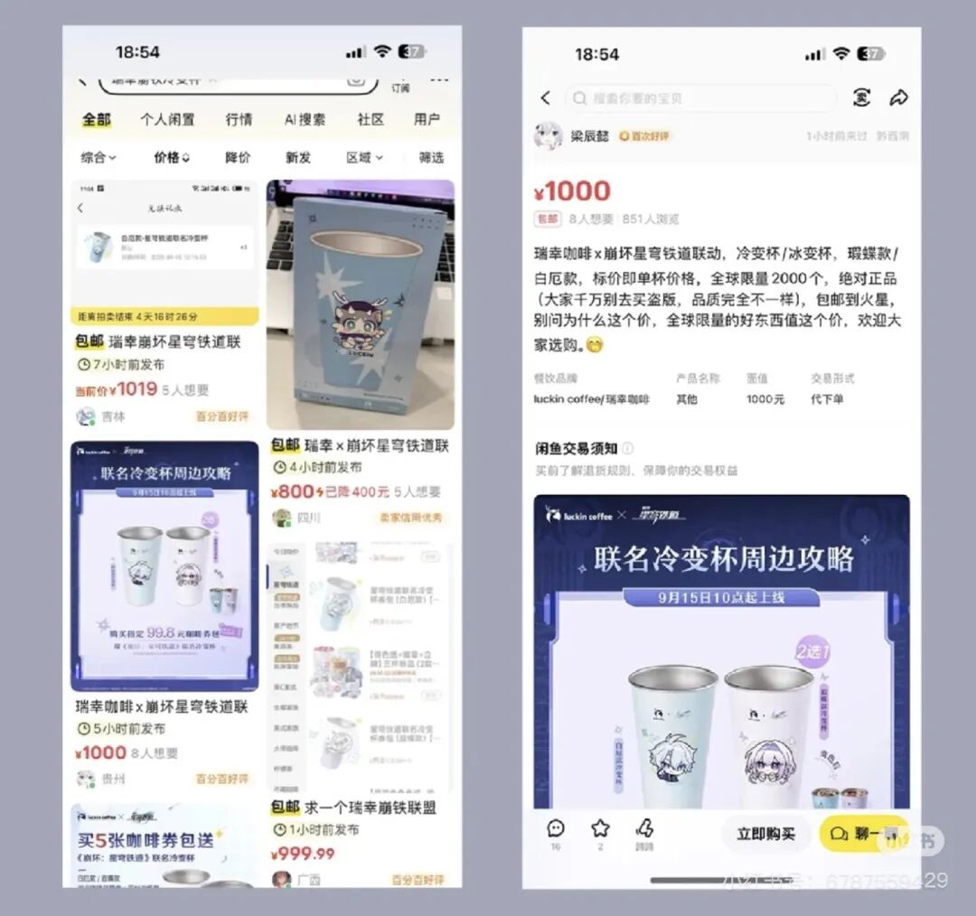 近期引爆话题的《崩坏:星穹铁道》与瑞幸咖啡联名,便在万众期待中栽了跟头。首先,活动设计受到质疑,消费者若想集齐全套周边(立牌、吧唧、色纸及冷变杯),需豪掷384元购入20杯饮品,被玩家直指为“捆绑消费”;同时,快闪周边限量供应,却没有预约和身份验证环节,导致活动首日下午,联动冷变杯便在二手平台被黄牛炒至800-1000元天价,玩家社群怨声载道。