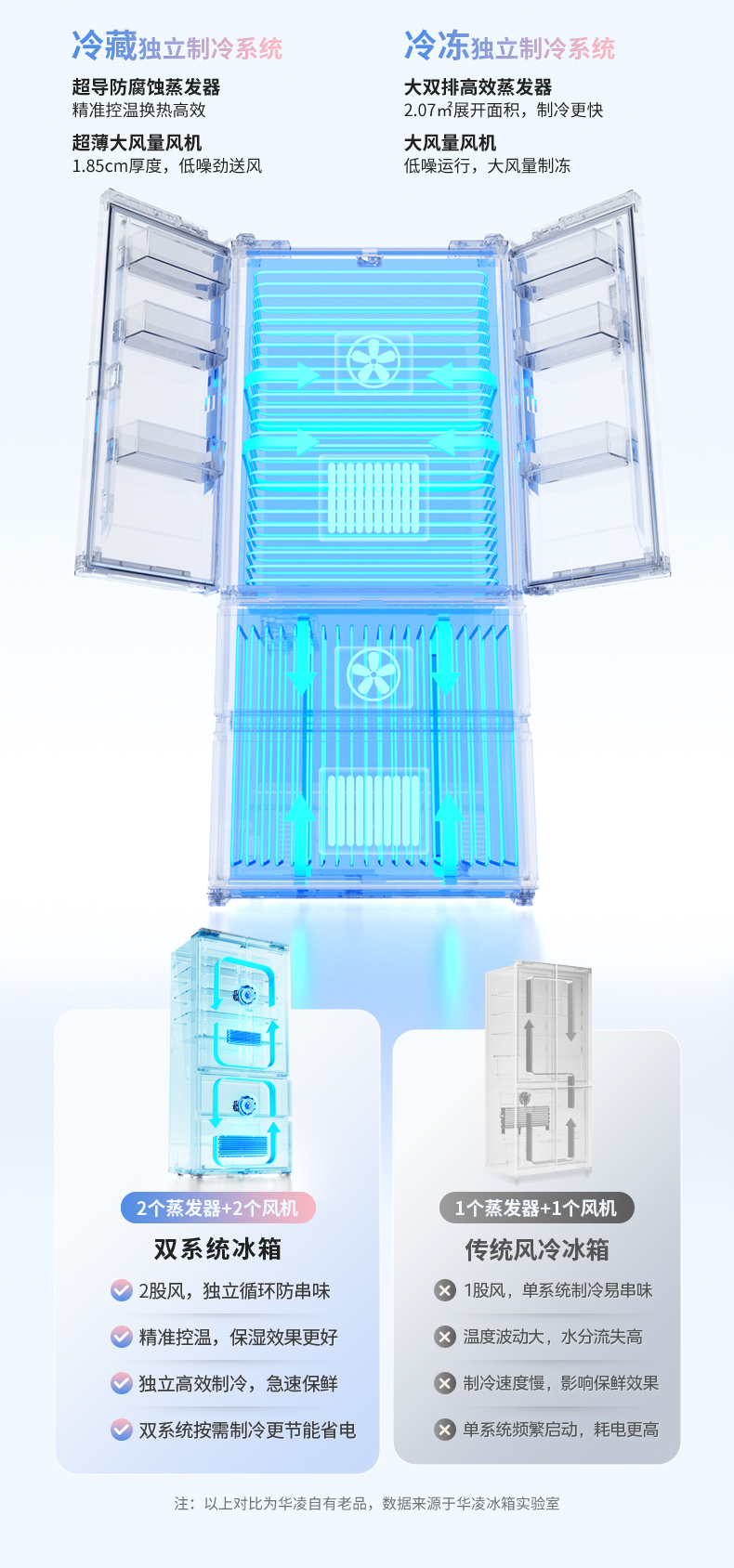 而华凌神机518新品搭载2个蒸发器+2个风机,冷藏冷冻双系统双循环防串味,上存榴莲,下放冰淇淋,互不打扰;双系统独立制冷,急速保鲜,肉类营养口感不流失;搭配高保湿空间,让绿叶菜持久水灵。