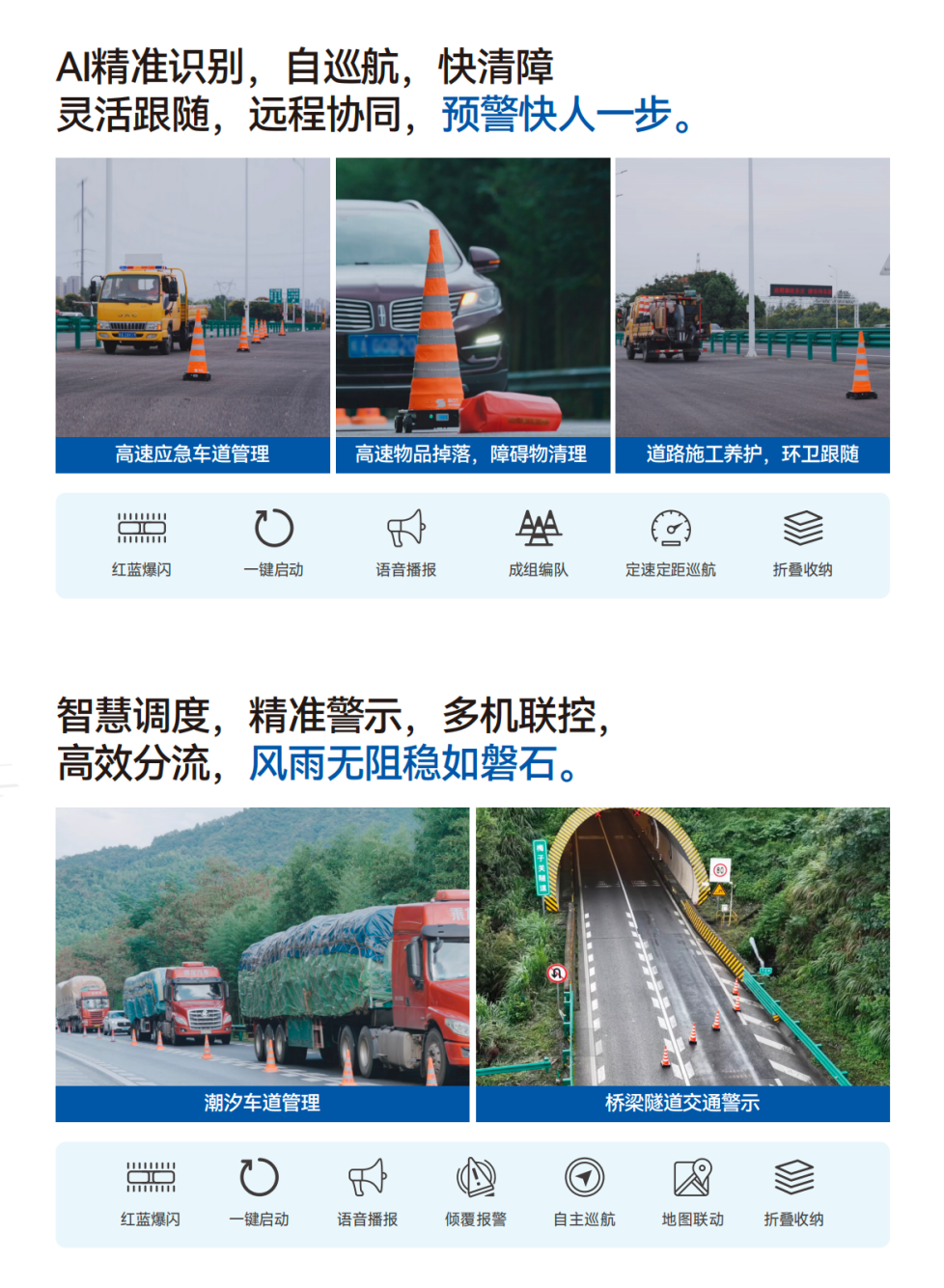 产品采用LoRa无线通信与4G物联网双模融合技术,保障复杂环境下信号稳定、响应及时,并支持无线充电,显著增强持续作业能力。内置AI芯片,集成高精度车道识别与定距巡航系统,可实现自动跟随与多机协同作业。独特的低重心设计与可折叠结构,既强化设备抗干扰和抗侧倾能力,也优化存储与运输便捷性。同时,系统具备智能定位、智能预警及动态防护功能,可在交通事故、道路施工等场景中实现快速布控和智能保障,甚至在异常车辆闯入时及时提示人员撤离,协同警车构建双重安全防线。