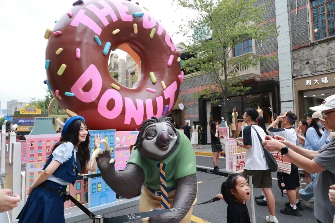 在《疯狂动物城》的活动里,在近8米高的超大型「甜甜圈」装置、爪印斑马线等主题元素的装点下,整个街区变为日常版动物城。