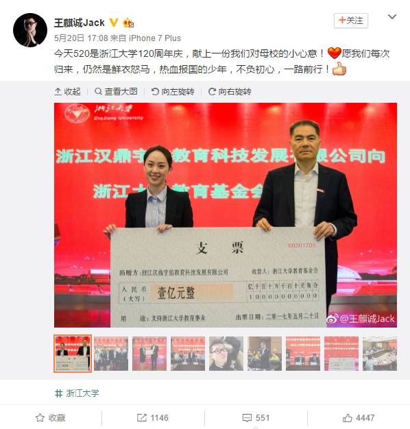 而在刚刚过去的浙江大学120年校庆,王麒诚和吴艳还向母校捐赠人民币1亿元,设立“浙江大学教育基金会汉鼎宇佑发展基金”,一时成为热点。