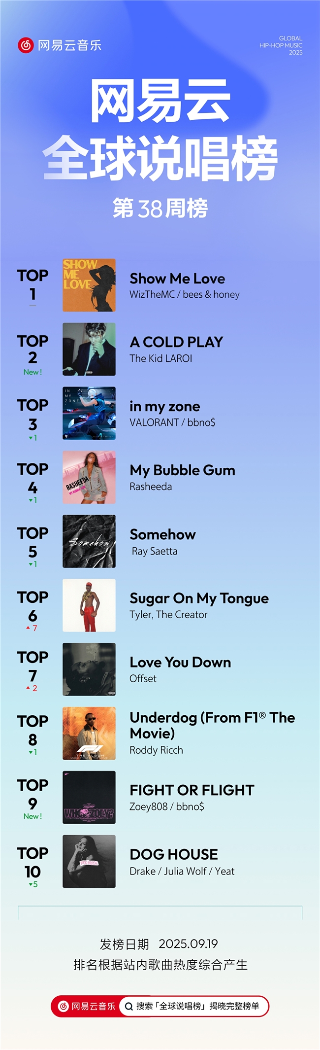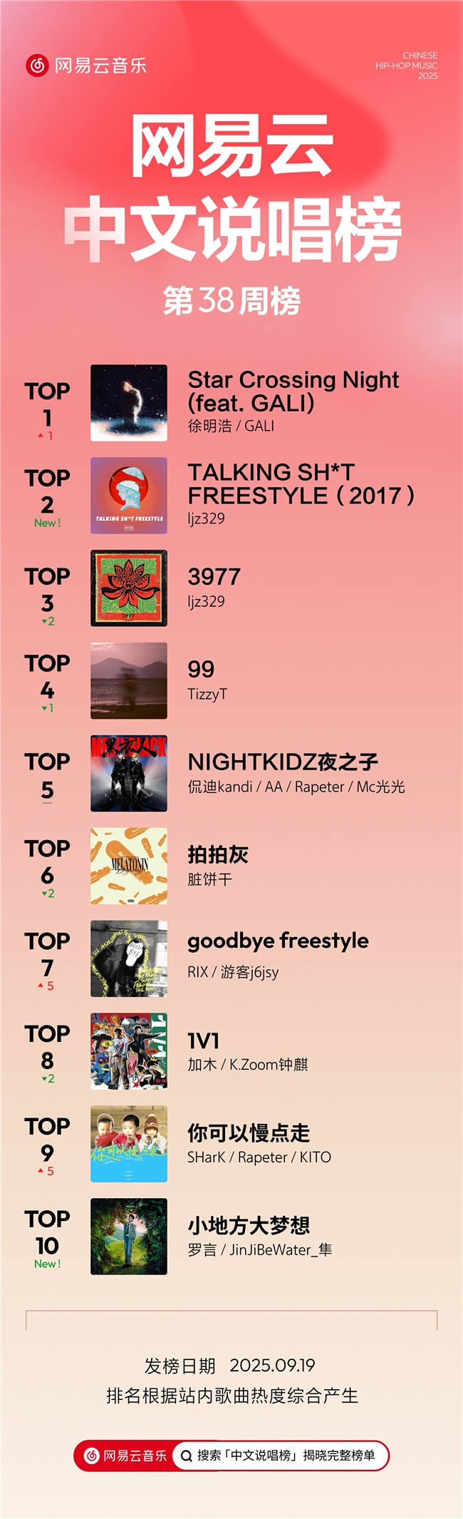 9月19日,网易云音乐发布2025年第38期说唱周榜。中文说唱榜方面,徐明浩与GALI合作单曲《Star Crossing Night》本周上升一位来到榜首,热度持续发酵。歌曲也成为近期短视频平台热门歌曲,成为诸多影视二创剪辑的“万能BGM”。TizzyT《99》、加木与K.Zoom钟麒合作的《1V1》等热度不减,持续位居榜单前十。《goodbye freestyle》《你可以慢点走》两首单曲排名均上升5位,冲入榜单前十。罗言与 JinJiBeWater_隼在《新说唱2024》中合唱的《小地方大梦想》推出录音室版本,一经发布便跻身榜单第十,引发广大乐迷对于离家逐梦的思考与共鸣。