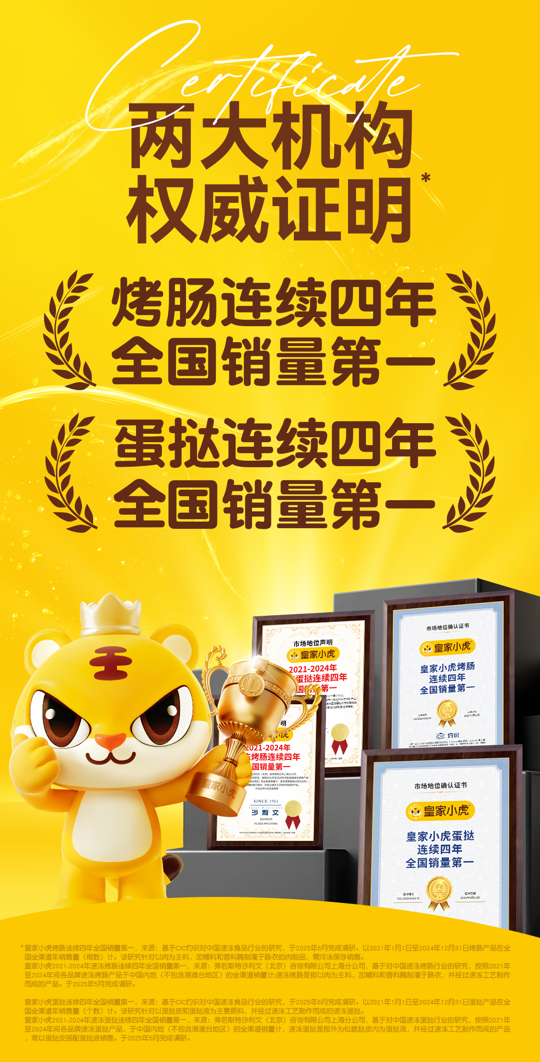 作为速冻食品全网销量第一品牌,速冻小吃大王皇家小虎致力于为中国大众消费者提供高品质的速冻食品,做用户的美好生活陪伴者。皇家小虎集食品研发、生产、销售于一体,凭借强大的品牌力与产品力支撑,在传统渠道与新兴渠道中,都具备显著的卖力优势,并受到了经销商、零售商与消费者的一致、广泛认可。截至2025年6月,皇家小虎取得了烤肠连续四年全国销量第一、蛋挞连续四年全国销量第一的成绩,皇家小虎品牌还荣获“2025年福布斯品牌大奖”、“福布斯ESG先锋企业”等多项大奖。