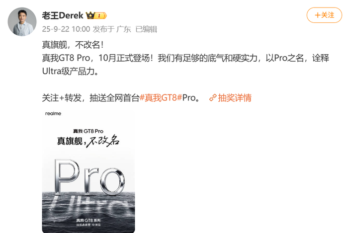 9月22日,真我副总裁@老王Derek 宣布,真我GT8 Pro将于10月发布。