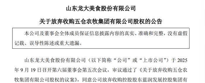9月19日晚间,山东龙大美食股份有限公司(代码:002726;简称:龙大美食)发布公告,经第六届董事会第五次会议审议,通过同意放弃收购控股股东蓝润发展控股集团有限公司(简称“蓝润发展”)所持有的五仓农牧集团有限公司股权(简称“五仓农牧”)。