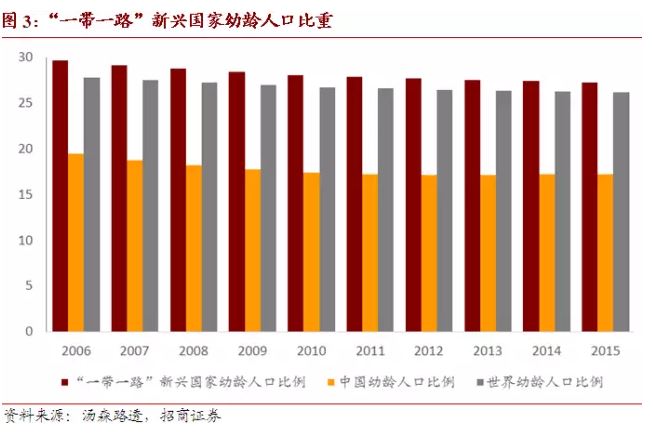 谢亚轩进一步指出,“一带一路”国家较之中国来说,更加“年轻”。“一带一路”沿线新兴经济体(不包括中国)低龄人口(0-14岁)的比重为27%,比中国的17.2%高10个百分点;其老龄人口(65岁以上)的比重为7.6%,比中国的8.3%低0.7个百分点;其劳动人口(15-64岁)的比重为65.5%,较中国的74.5%低10个百分点。