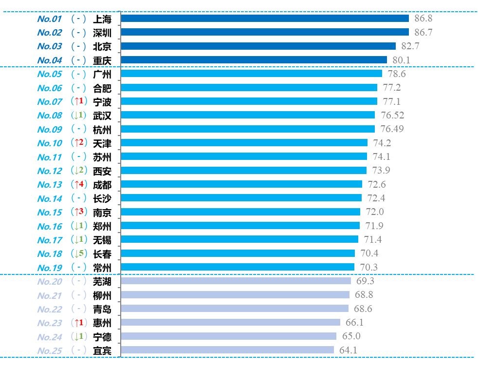 从总指数看,25座城市继续分为三个梯队,但第一、二梯队城市数量扩容。第一梯队城市评估分值大于80分,综合竞争优势明显,由3座城市扩容至4座城市,其中上海、深圳、北京继续保持前三位,重庆分值突破80分,进入领跑方阵。第二梯队城市评估分值在70-80分之间,具有独特比较优势,由13座城市扩容至15座城市,分别是广州、合肥、宁波、武汉、杭州、天津、苏州、西安、成都、长沙、南京、郑州、无锡、长春、常州。第三梯队城市评估分值在60-70分之间,在细分领域各有特色长板或较大发展潜力,主要有6座城市,分别是芜湖、柳州、青岛、惠州、宁德、宜宾。